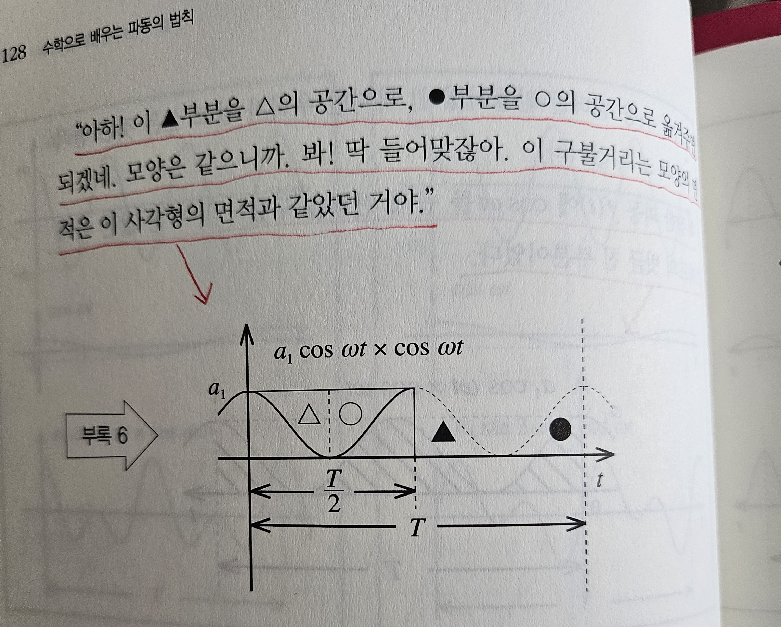 수식으로만 증명했고 정제된 공식만 외웠다. 이책은 삼각함수의 적분을 설명하면서 가위와 풀로 삼각함수의 그래프를 오려 붙여가며 한주기 동안의 삼각함수 적분이 0 임을 설명한다. 단순한 시도지만 수식만으로는 느낄 수 없는 생생한 직관을 얻었다. 논어에 학이불사즉망(學而不思則罔)이라는 구절이 있다. 배우기만 하고(學而) 생각할 여유가 없었기 때문에(不思) 나는 수학에서 망했던 것이다(則罔).