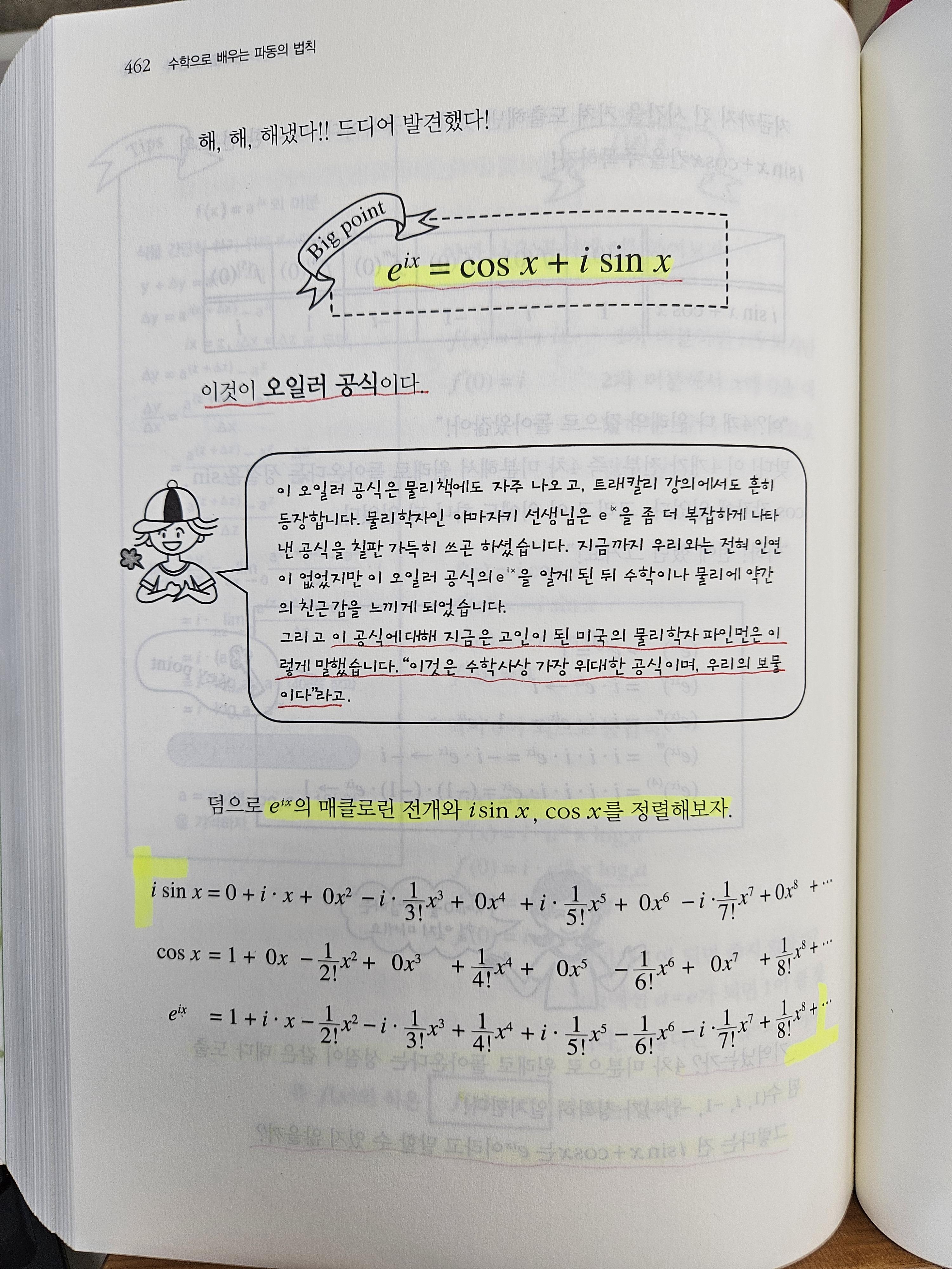 이제 e의 복소지수 수식을 보면 그 이면의 코사인 함수와 사인 함수가 보인다. 오일러 공식과 친해진 것이다. 기쁘다.