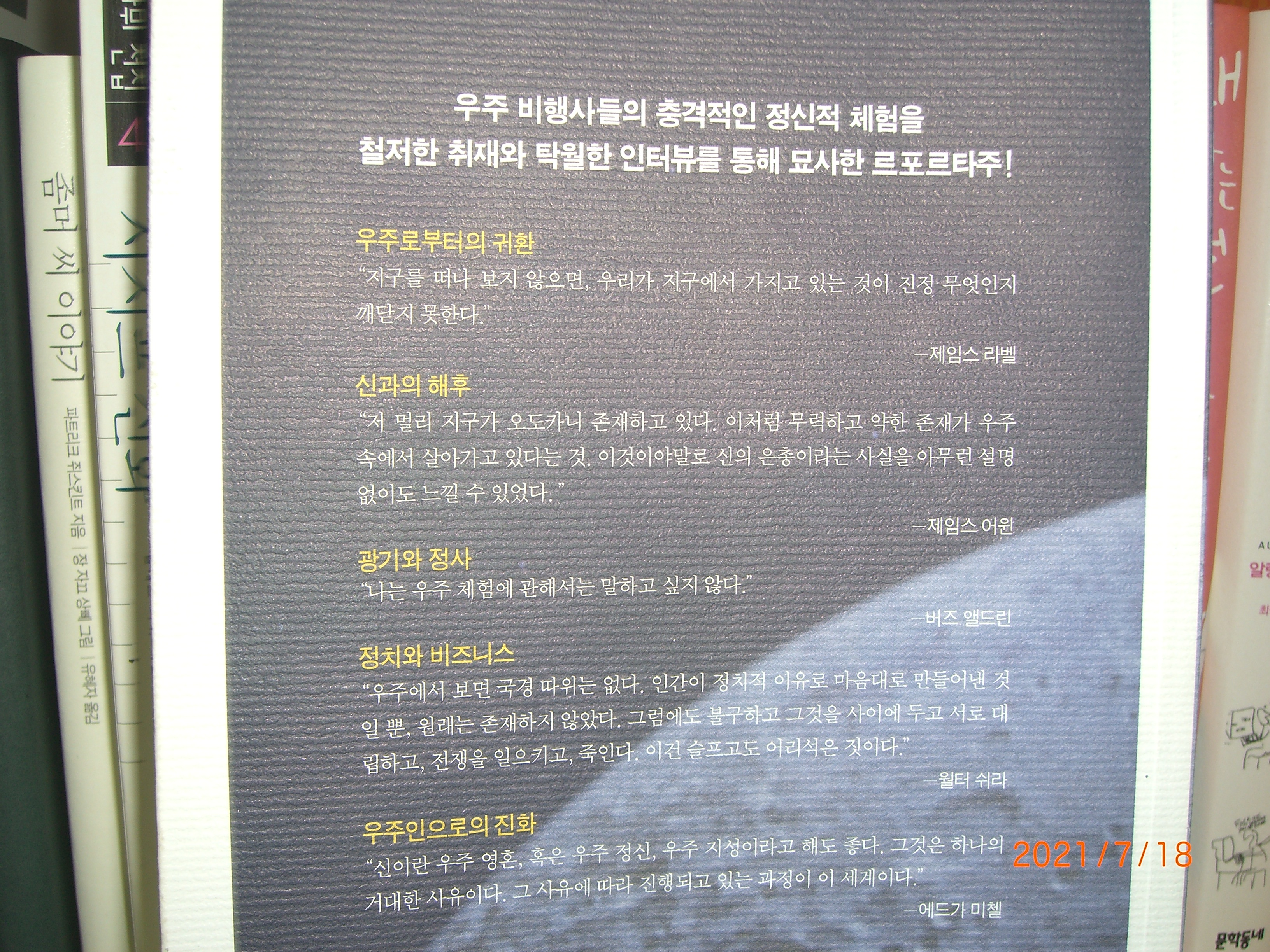 적막한 우주 속을 홀로 유영할 때, 또는 달에 착륙해서 광활한 우주와 그 속에 떠 있는 조그만 지구를 올려다볼 때, 어떤 느낌이 들까? 이 책은 그런 체험을 가진 우주비행사들을 찾아가 인터뷰한 기록이다.